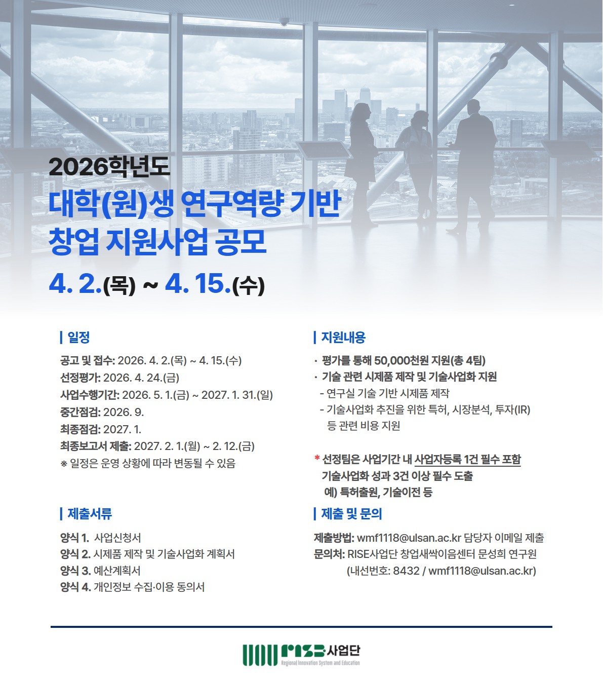 [창업새싹이음센터] 2026학년도 대학(원)생 연구역량 기반 창업 지원사업 공모 최고관리자 2026.04.03 10:23 조회64 최고관리자 0 64 04.03 10:23 2026학년도 대학원생 연구역량 기반 창업 지원사업 공모제출서류 양식.hwp (145.5K) + 1 내용