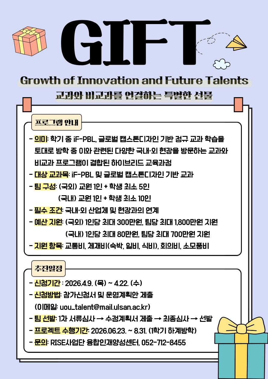 RISE사업단 융합인재양성센터에서는 2026학년도 1학기 GIFT 교육과정을 아래와 같이 운영하고자하오니,