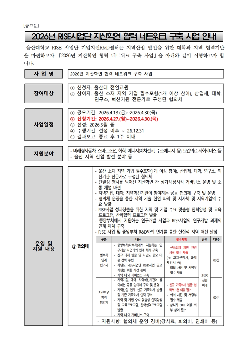 [기업지원R&D센터] 지산학연 협력 네트워크 발굴 및 운영 사업 공모 최고관리자 2026.04.13 10:09 조회26 최고관리자 0 26 04.13 10:09 [공고문] 2026년 지역기업 애로기술 수요 발굴 및 컨설팅 지원 사업 안내.pdf (108.2K) + 3 내용 신청 양식은 U-NUXUS 참조 바랍니다. ::울산대학교 산학연협력 공유 플랫폼::