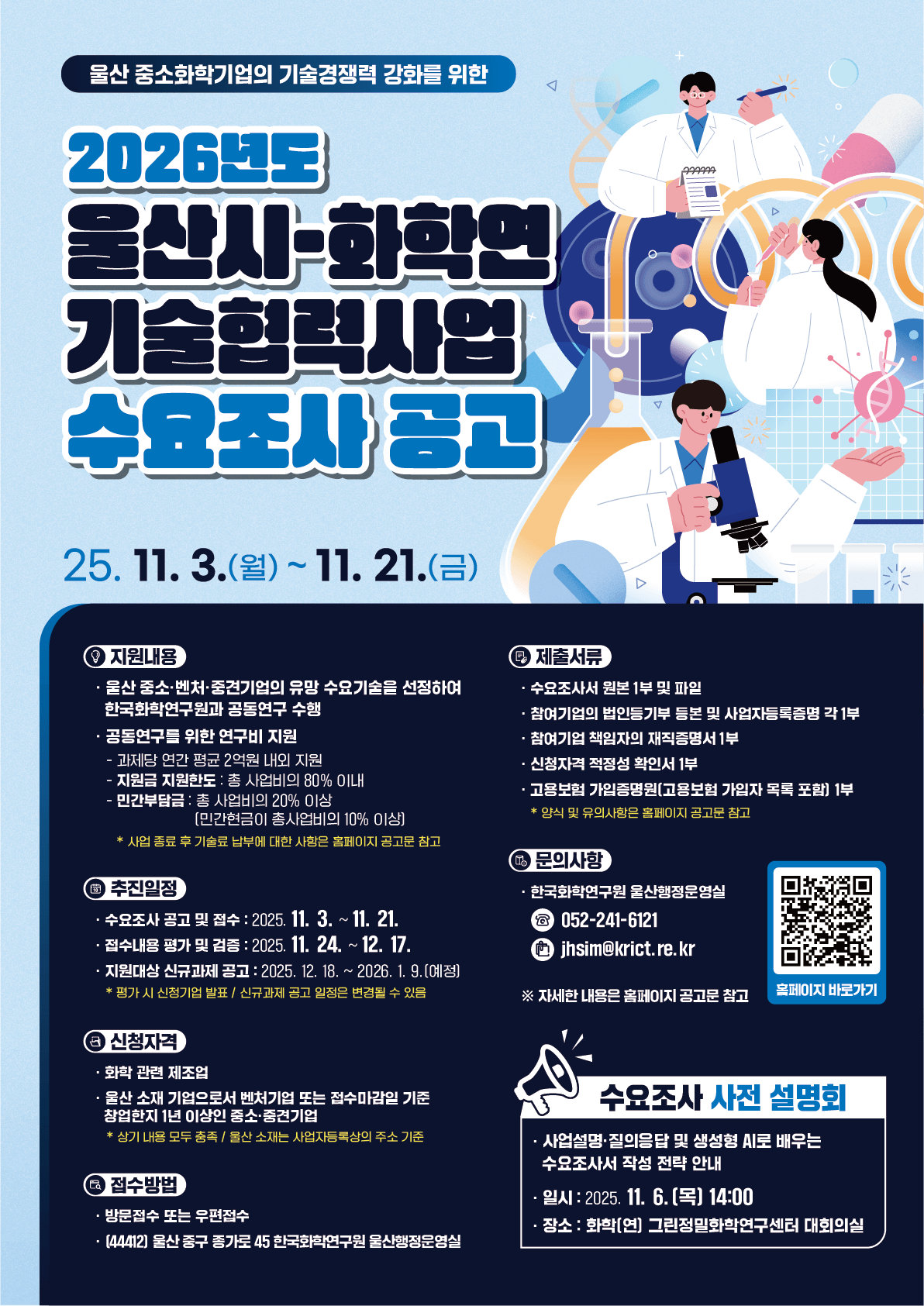울산광역시와 한국화학연구원은 울산 지역 화학산업 육성 및 기술경쟁력 강화를 위해 **「울산광역시-한국화학연구원 기술협력사업」** 을 운영하고 있습니다. 2026년도 사업 수요조사 및 공고와 관련하여 아래 내용을 안내드리오니, 울산지역 중소·벤처·중견기업의 많은 관심과 참여 부탁드립니다. * 공고 확인 링크한국화학연구원 공고문: https://www.krict.re.kr/bbs/BBSMSTR_000000000685/view.do?nttId=B000000108261Pm3mT8