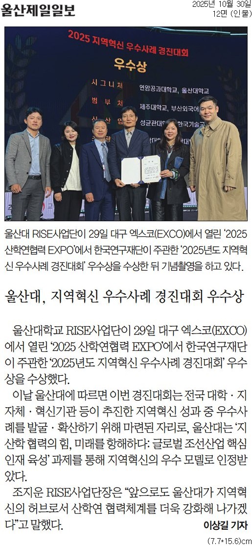 울산대 RISE사업단이 29일 대구 엑스코(EXCO)에서 열린 ‘2025 산학연협력 EXPO’에서 한국연구재단이 주관한 ‘2025년도 지역혁신 우수사례 경진대회’ 우수상을 수상한 뒤 기념촬영을 하고 있다. 울산대학교 RISE사업단이 29일 대구 엑스코(EXCO)에서 열린 ‘2025 산학연협력 EXPO’에서 한국연구재단이 주관한 ‘2025년도 지역혁신 우수사례 경진대회’ 우수상을 수상했다. ▼ 지면기사 송출