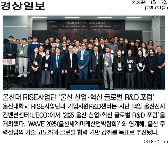 ▲ 울산대학교 RISE사업단과 기업지원R&D센터는 지난 14일 울산전시컨벤션센터(UECO)에서 ‘2025 울산 산업·혁신 글로벌 R&D 포럼’을 개최했다. ‘WAVE 2025(울산세계미래산업박람회)’와 연계해, 울산 주력산업의 기술 고도화와 글로벌 협력 기반 강화를 목표로 추진됐다. 울산대학교 RISE사업단과 기업지원R&D센터는 지난 14일 울산전시컨벤션센터(UECO)에서 ‘2025 울산 산업·혁신 글로벌 R&D 포럼’을 개최했다. ‘WAVE 2025(울산세계미래산업박람회)’와 연계해, 울산 주력산업의 기술 고도화와 글로벌 협력 기반 강화를 목표로 추진됐다. ▼ 지면기사