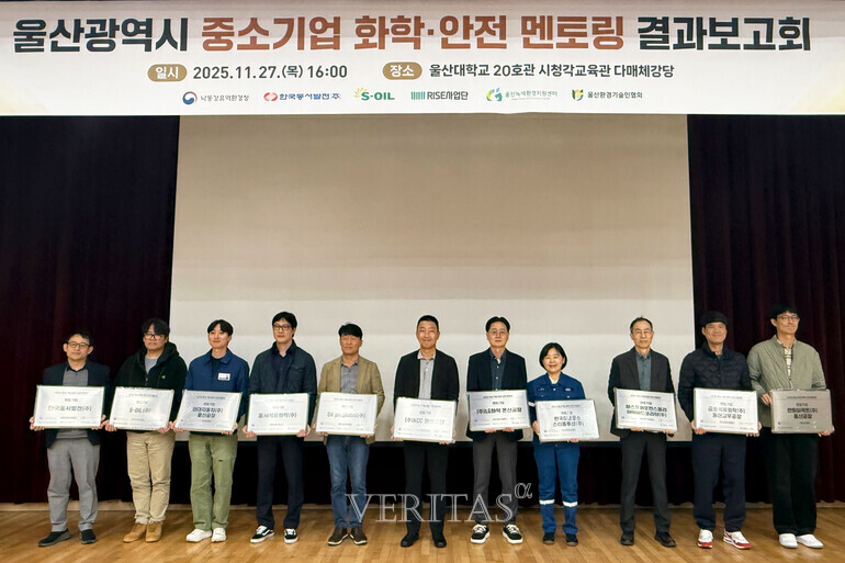 [베리타스알파=박소현 기자] 울산대 RISE사업단은 27일 '울산 중소기업 화학/안전 멘토링 사업 성과공유 결과보고회'를 열었다고 28일 밝혔다. 이번 행사는 울산지역 대기업 12개사와 중소기업 24개사를 비롯해 환경청, 협회 등 약 60여 명이 참석한 가운데, 8개월간 추진된 안전 점검/진단/교육 활동의 성과를 공유하고 산업현장의 안전관리 수준을 높이기 위해 마련됐다.