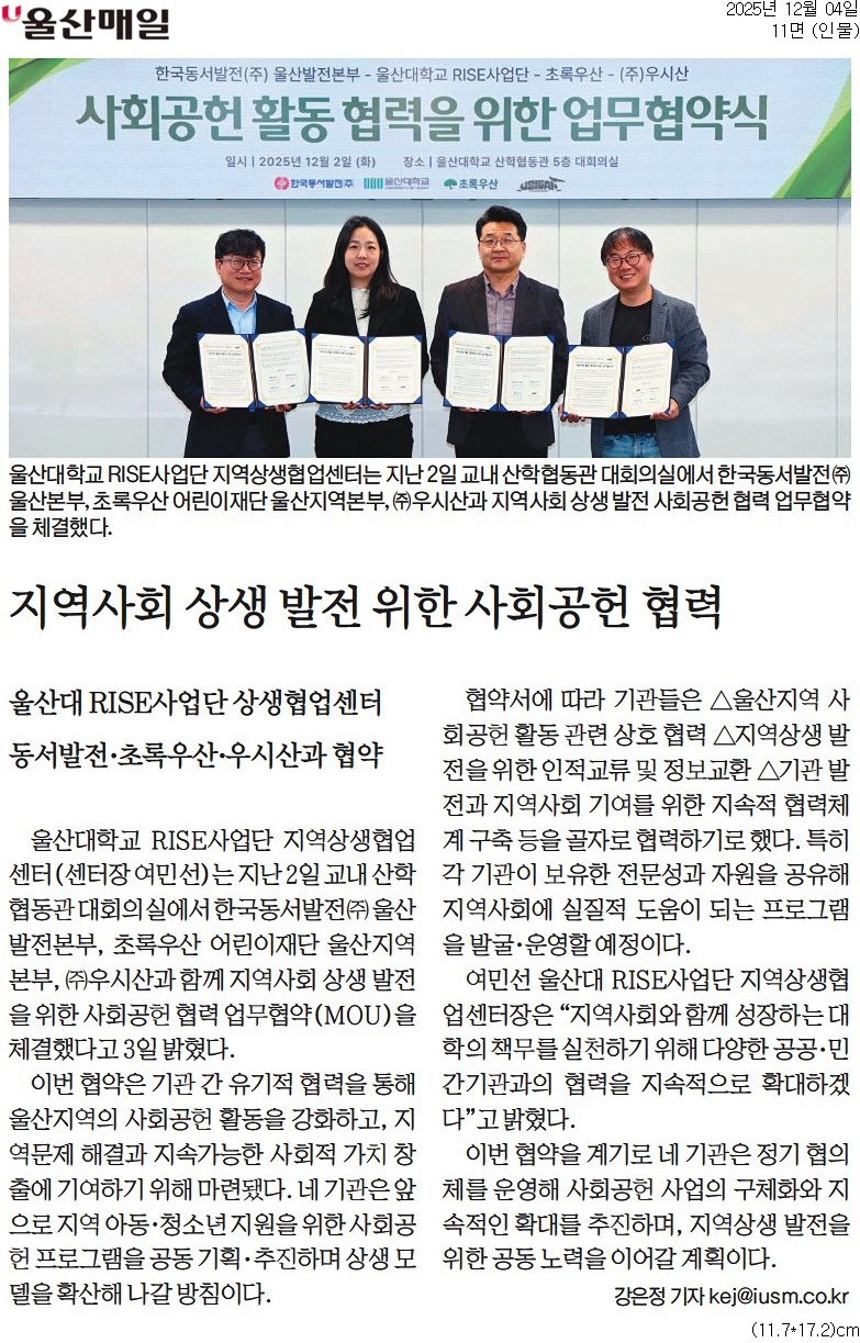 울산대학교 RISE사업단 지역상생협업센터(센터장 여민선)는 2일 교내 산학협동관 대회의실에서 한국동서발전㈜ 울산발전본부, 초록우산 어린이재단 울산지역본부, ㈜우시산과 함께 지역사회 상생 발전을 위한 사회공헌 협력 업무협약(MOU)을 체결했다고 3일 밝혔다.