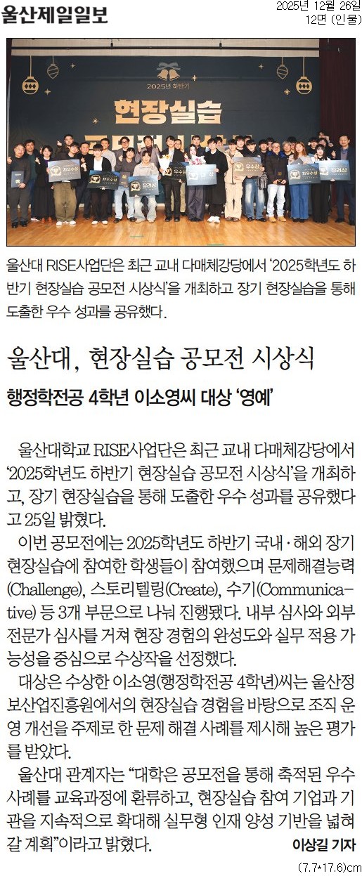 울산대 RISE사업단은 최근 교내 다매체강당에서 ‘2025학년도 하반기 현장실습 공모전 시상식’을 개최하고 장기 현장실습을 통해 도출한 우수 성과를 공유했다. 울산대학교 RISE사업단은 최근 교내 다매체강당에서 ‘2025학년도 하반기 현장실습 공모전 시상식’을 개최하고, 장기 현장실습을 통해 도출한 우수 성과를 공유했다고 25일 밝혔다. ▼ 지면기사